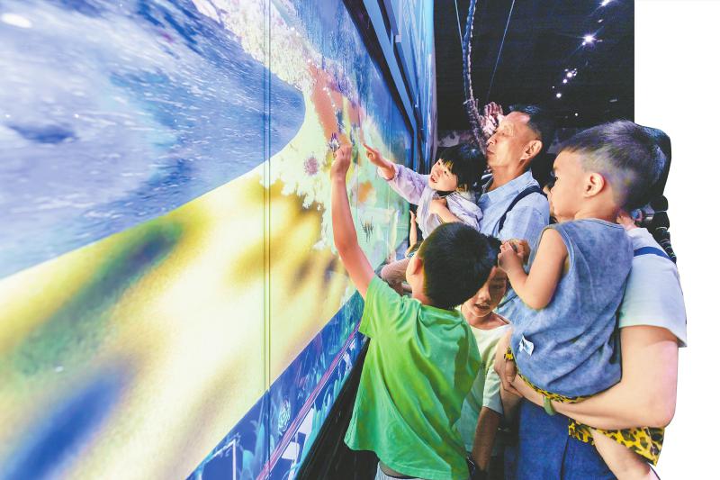 小朋友们在屏幕前互动。