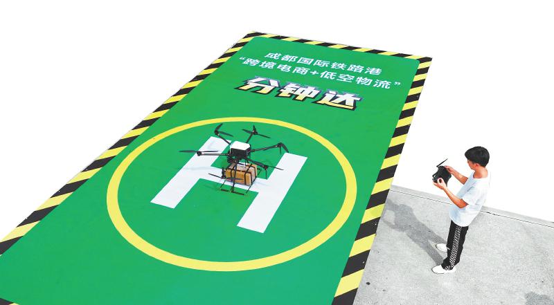 工作人员正在操作无人机从成都国际铁路港综合保税区起飞,将货物送往亚蓉欧国家(商品)馆OTO跨境体验中心店。白桂斌 摄(C视觉)