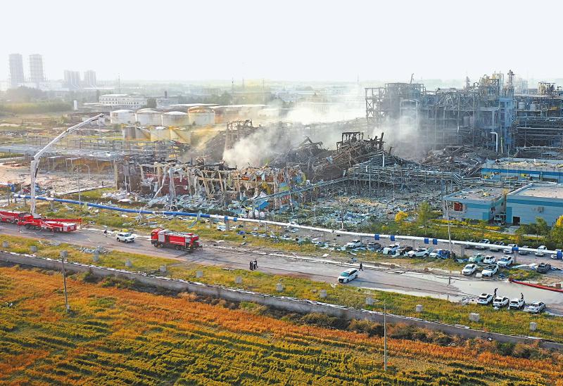 影像志 山东高密一家化工厂发生爆炸事故 记者从山东省高密市应急管理局获悉,27日11时57分左右,高密市友道化学有限公司一车间发生爆炸事故。经各级组织力量全力搜救,截至19时25分,事故造成5人死亡,6人失联,19人轻伤。图为救援力量在事故现场处置。