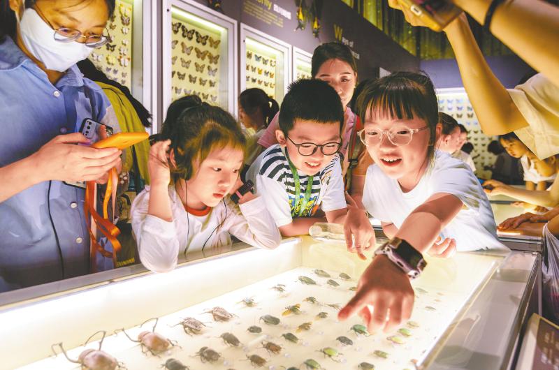孩子们在观察昆虫标本。