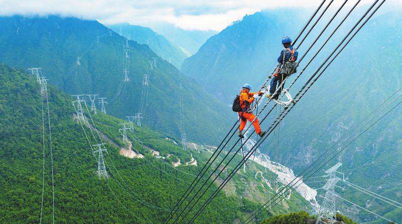 5月26日,在甘孜藏族自治州康定市日地村,高空电力工人检查输电线路的导线及各类附件。 张超 摄(C视觉)