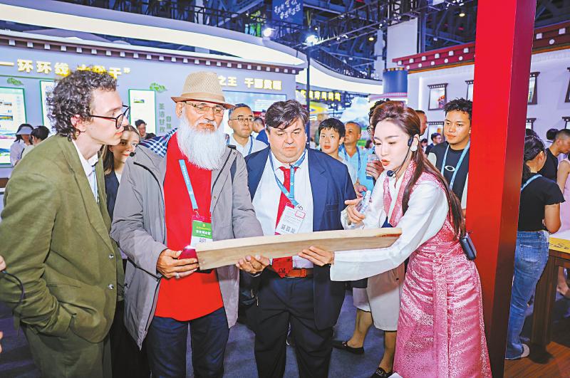 5月25日,境外客商在西博会甘孜馆了解雕版印刷工艺。