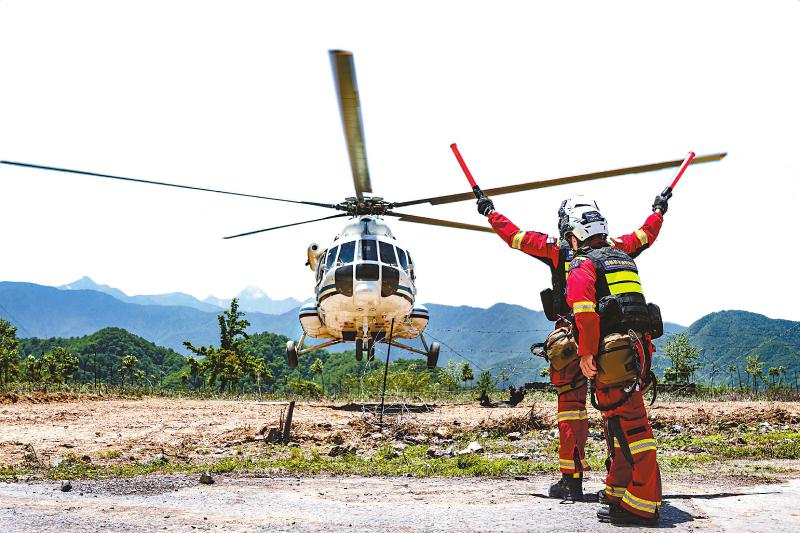 在近日举行的全省防灾减灾救灾演练中,消防员开展直升机孤岛救援。 图片由四川省消防救援总队提供