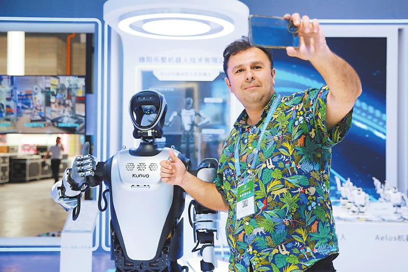 5月26日,参会的境外客商在西博会绵阳馆和乐聚机器人合影。