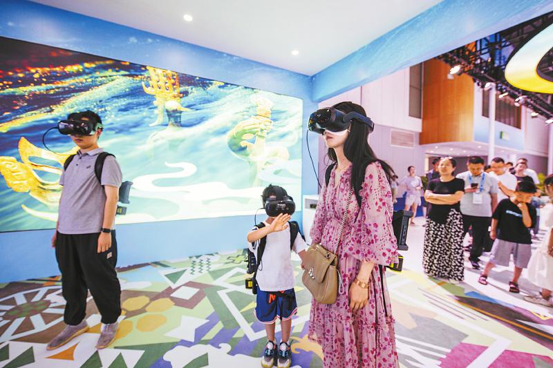 5月25日,观众戴上VR眼镜在西博会现场感受三星堆文物带来的视觉效果。