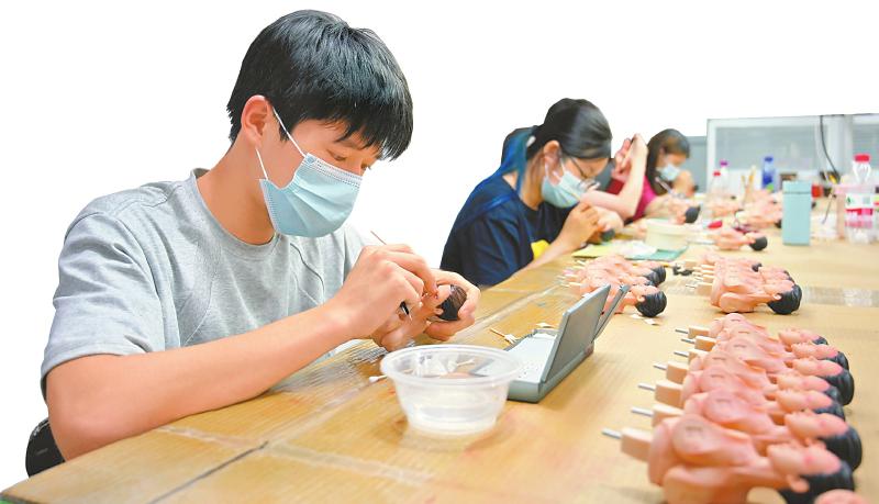 手办模玩生产车间里,年轻人正在参与“谷子”涂装工作。
