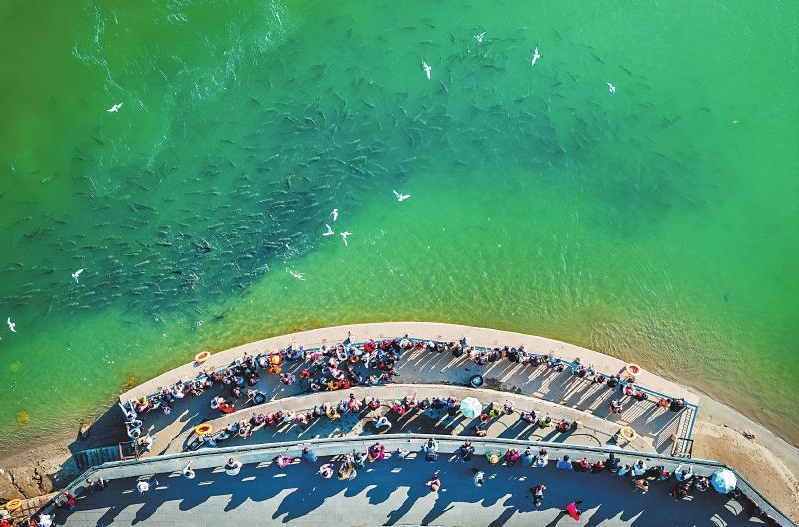 宜宾三江口鱼游鸟飞,引来市民围观。 兰锋 摄