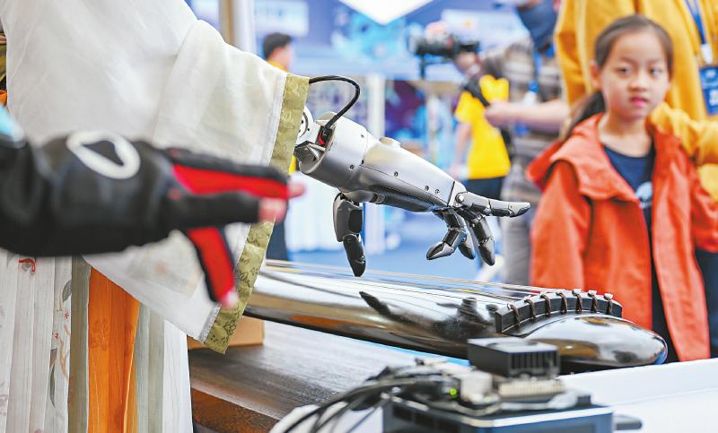 游客观看机器人演奏古琴