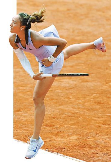 六月三日,郑钦文在比赛中发球。新华社记者李京摄