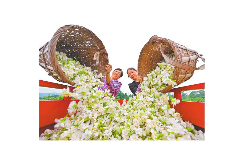 6月6日,在眉山市仁寿县汪洋镇涂家社区,当地农民正在采摘、转运栀子花。
