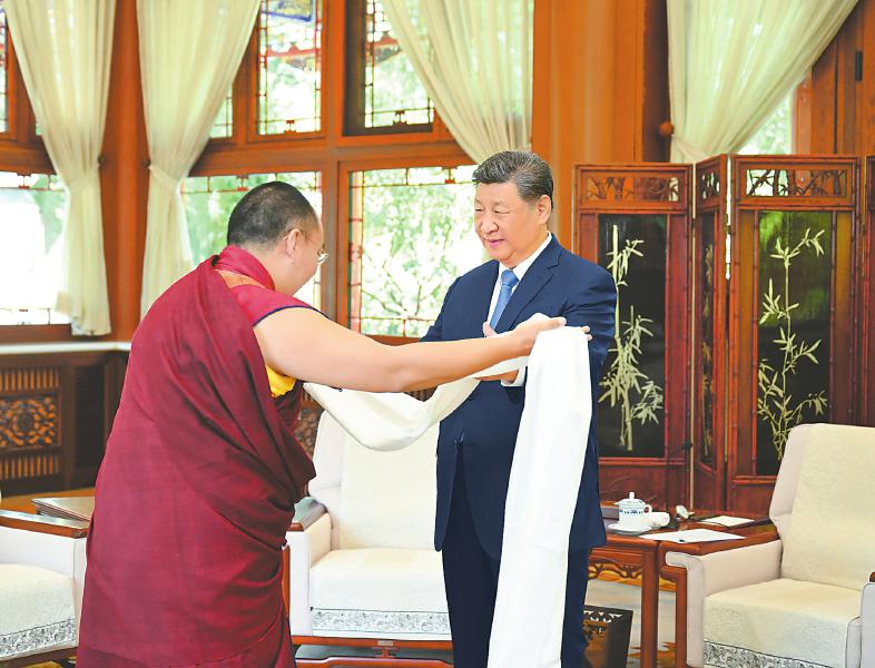 六月六日,中共中央总书记、国家主席、中央军委主席习近平在北京中南海接受班禅额尔德尼·确吉杰布拜见。这是班禅向习近平敬献哈达。新华社记者谢环驰摄