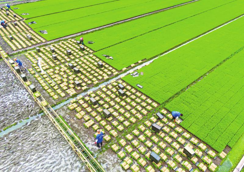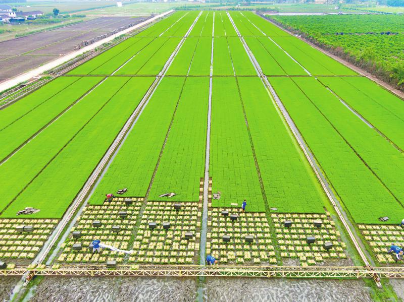近日,德阳市旌阳区孝感街道红伏村一家育秧基地,工人在起运秧苗。旌阳区以土地托管为切入点,大力推广“菜单式”“保姆式”托管服务模式,有效促进农业增效、农民增收。唐渝川 摄(C视觉)