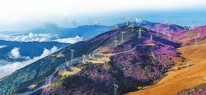 凉山州拥有丰富的风电资源,矗立在大凉山山间的风力发电机,与盛开的索玛花构成一幅美丽图景。 凉山州委宣传部供图