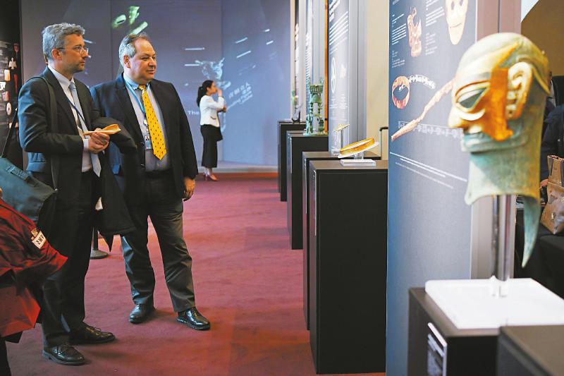 当地时间6月9日,在位于纽约的联合国总部,人们参观“太阳之光——古蜀文明与世界”展览。 新华社记者 李睿 摄