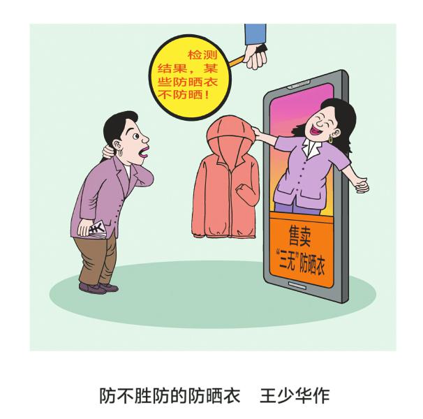 近日,媒体曝光的“不防晒的防晒衣”一事,引发广泛关注。据报道,这些被曝光的防晒衣,既无产品名称、生产厂商,也无厂址,是典型的“三无”产品。但不少商家却打着“UPF50+”等高防晒指数的幌子,在市场上大行其道,严重侵害了消费者的合法权益,也扰乱了正常的市场秩序。 王少华 图