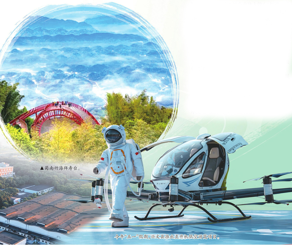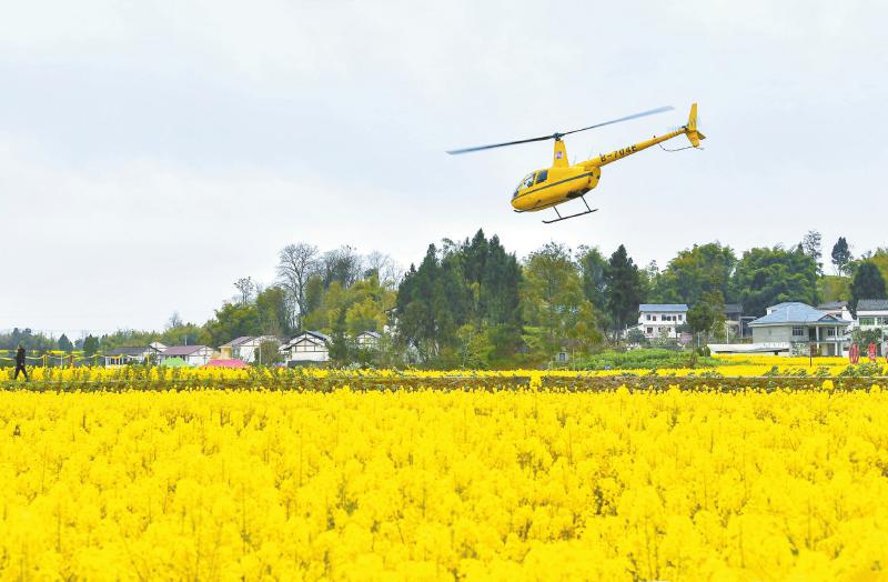 广安市广安区花桥镇,游客乘坐直升机观赏油菜花。
