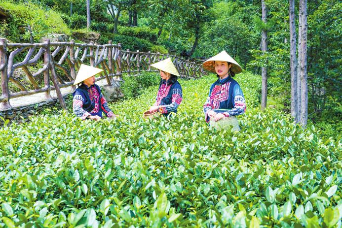 采茶女在茶园采摘茶叶。