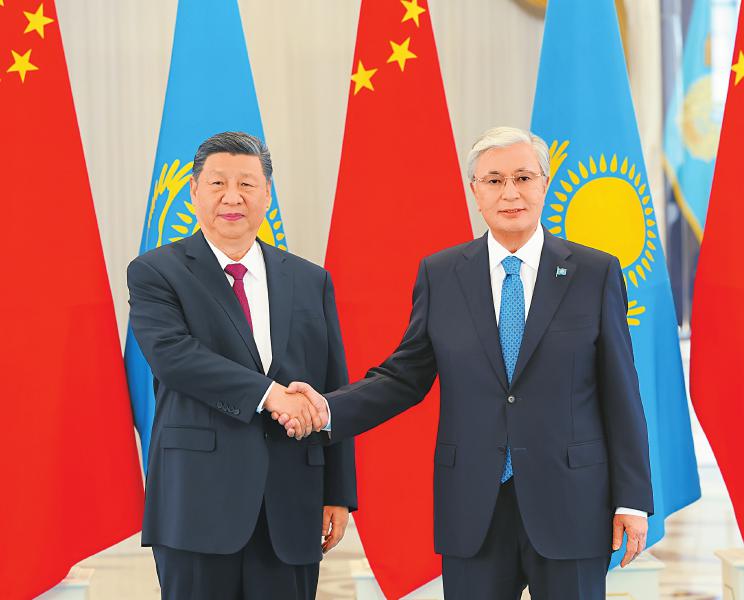 当地时间6月16日下午,哈萨克斯坦总统托卡耶夫同中国国家主席习近平在阿斯塔纳总统府举行会谈。 新华社记者 黄敬文 摄