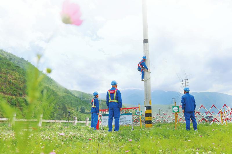 海来木加(右)在国网四川省电力公司喜德县供电分公司光明供电所辖区进行杆塔检修作业。 施少府 摄