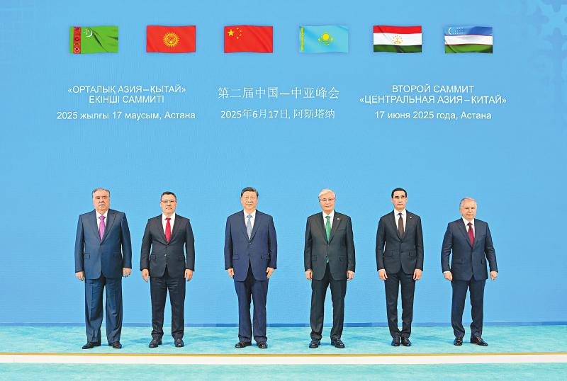 当地时间六月十七日下午,第二届中国-中亚峰会在阿斯塔纳独立宫举行。哈萨克斯坦总统托卡耶夫主持会议。中国国家主席习近平、吉尔吉斯斯坦总统扎帕罗夫、塔吉克斯坦总统拉赫蒙、土库曼斯坦总统别尔德穆哈梅多夫、乌兹别克斯坦总统米尔济约耶夫出席。这是习近平同中亚五国元首集体合影。新华社记者 谢环驰 摄