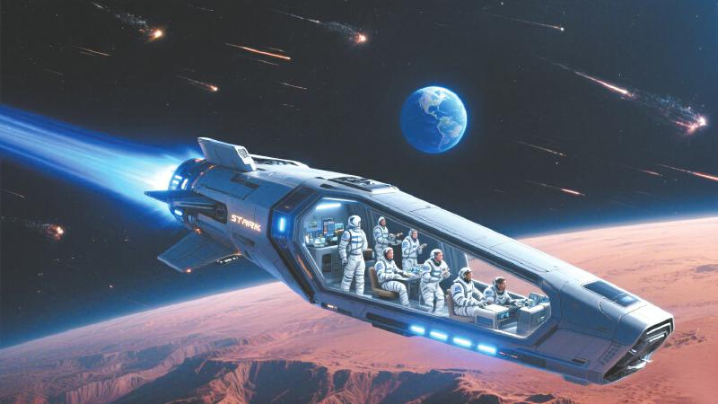 乘坐星舰去往火星,是人类探索宇宙的雄心写照,人类正以技术为笔,在宇宙画布上勾勒未来。 图片由AI生成