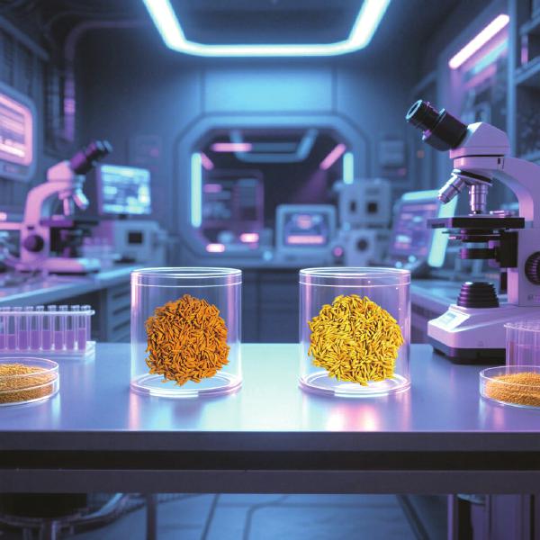 太空诱变后颜色发生变化的水稻(左)和普通水稻(右)。 图片由AI生成