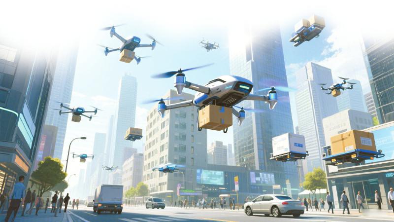 无人机正编织起一张看不见的低空物流网络,以颠覆性的姿态重塑现代生活图景。 图片由AI生成