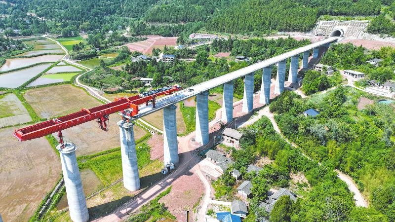 近日,成达万高铁7标段何家湾跨木老干渠特大桥完成第13片箱梁精准架设。该桥位于南充市嘉陵区龙蟠镇,全长1010.92米,共需架设31片箱梁。此次架设标志着标段内桥梁架设工作全面“加速”。 何萌 摄
