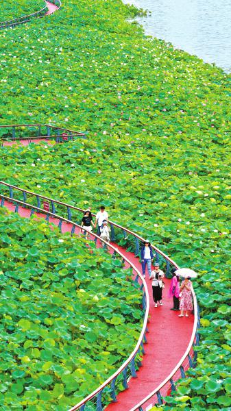 目前,岛上建设的世界荷花博览园已获评国家4A级旅游景区,园内荷花沿观音湖布局,种植面积600余亩,来自23个国家和地区,有近800种20万余株。 遂宁观察 刘作鹏 摄