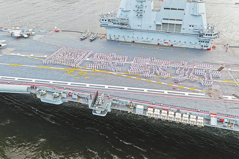 7月3日,中国海军山东舰航母编队抵达香港。这是山东舰官兵在飞行甲板上列队排出“国安家好”字样(无人机照片)。在香港回归祖国28周年之际,由中国人民解放军海军航空母舰山东舰,导弹驱逐舰延安舰、湛江舰及导弹护卫舰运城舰组成的航母编队,携多型舰载战斗机、直升机和陆战队员,于3日上午抵达香港特别行政区,开启为期5天的访问活动。新华社发(蒲海洋 摄)