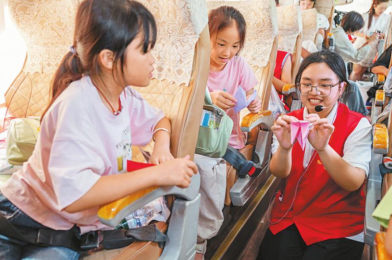 7月3日,车停靠休息时,志愿者教孩子们折纸鹤,以缓解旅途劳顿。