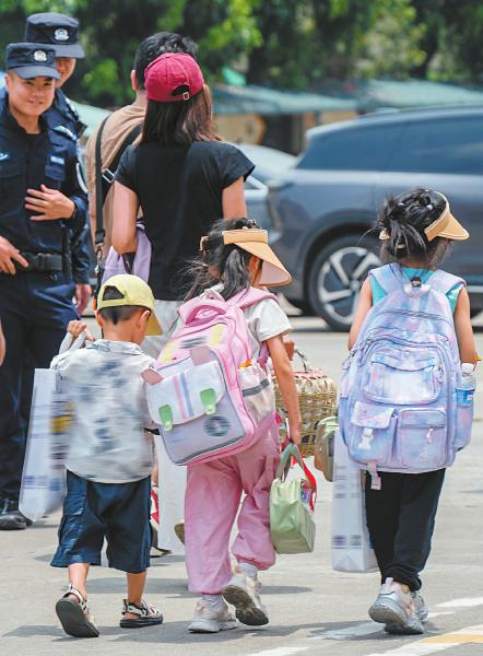 7月4日,广东省东莞市大朗镇,大朗派出所民警给孩子们发放暑期大礼包。