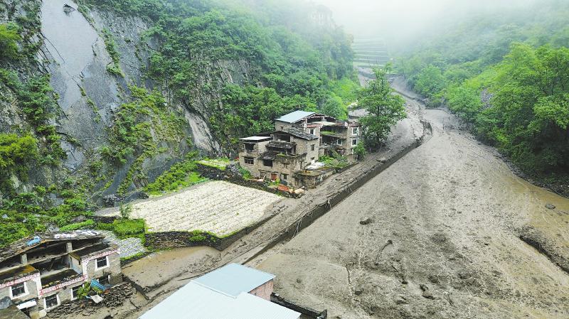 7月3日上午,阿坝州理县下孟乡嘉康村查谷沟泥石流冲向农田。阿坝州气象局供图