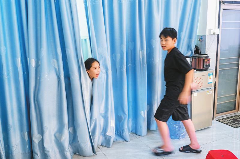 7月4日,李涛和妹妹李楒瑶在东莞市大朗镇父母家中玩耍。