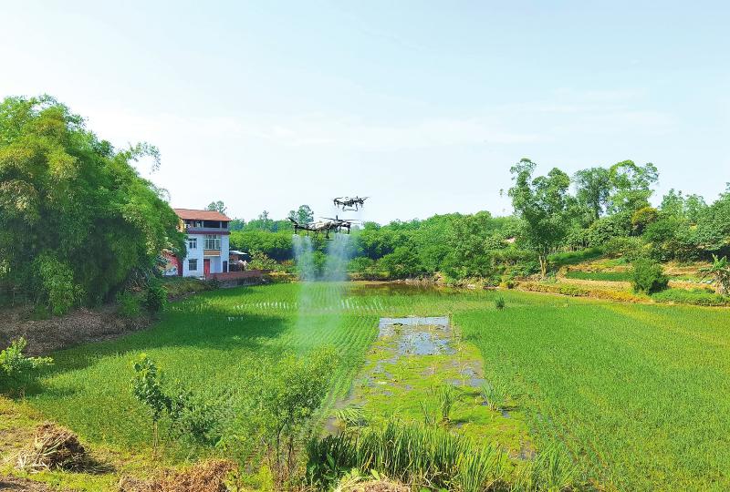 无人机飞手在自贡市贡井区桥头镇玉麒村开展水稻病虫害统防统治。温家林 摄