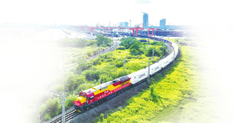 7月9日,在成都国际铁路港,一列满载55柜半成品液晶电视及齐套散件的中欧班列(成渝)南通道首趟速达班列向着欧洲发车驶出。
