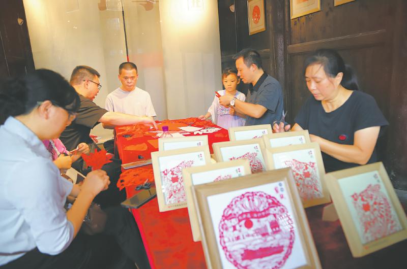 游客在关庙剪纸体验厅学技艺。武胜县融媒体中心供图