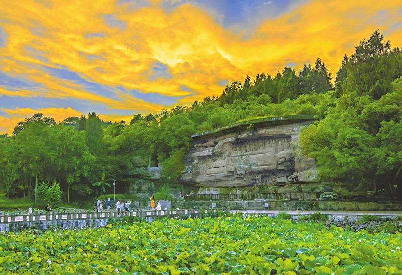 7月6日,资阳市安岳县卧佛院景区,游客观赏晚霞映照下的千年卧佛。近年来,安岳县依托卧佛院全国重点文物保护单位与跑马滩水库资源,把卧佛村农文旅融合示范点项目作为资(阳)大(足)文旅融合发展示范区建设的重要节点项目予以重点建设,全力打造集水乡自然风光休闲漫游、乡野自然研学教育、修身旅游养老于一体的特色文旅目的地。 杨康忠 摄(C视觉)