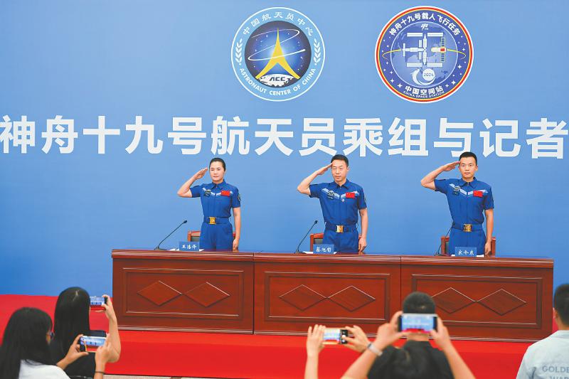 7月9日,在北京航天城,神舟十九号航天员蔡旭哲(中)、宋令东(右)、王浩泽在记者见面会上敬礼致意。这是神舟十九号乘组太空归来后首次公开亮相。 新华社记者 厉彦辰 摄