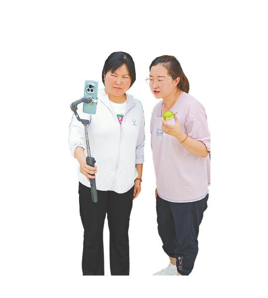 陵江镇笋子沟村党支部书记张桂华(右)正在直播间销售本地特产翠冠梨。 四川日报全媒体记者 陈旻翔 摄