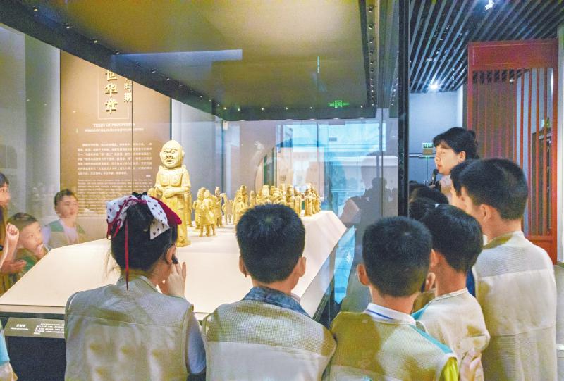 参加四川博物院暑期夏令营的孩子们在展厅学习。