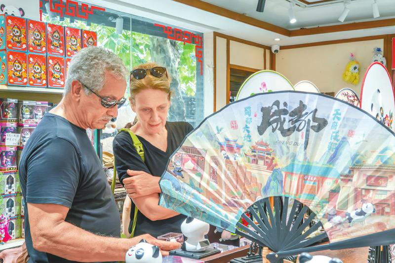 8月2日,外国友人在成都宽窄巷子挑选熊猫装饰品。邓显杰 摄(C视觉)