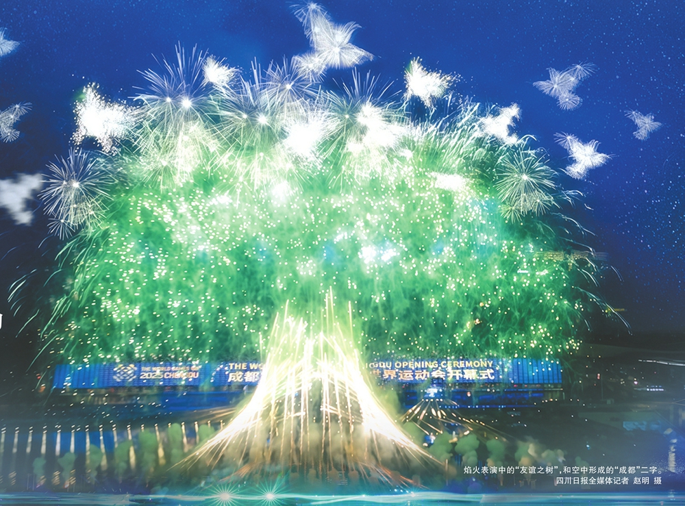 成都世运会开幕式焰火绚烂,主题曲表演结束后,一棵以成都金沙遗址大树根遗迹和四川活化石珙桐树为创意灵感的“友谊之树”,在夜空中缓缓生长,开满“鸽子花”