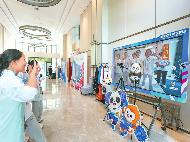 8月3日,世运村A区中文学习互动体验区,志愿者测试自拍互动相机。新华社记者 王曦 摄