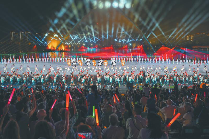 运动员入场仪式上,引导员手中的引导牌,外形是芙蓉花瓣。用材上,融入了非物质文化遗产——银花丝、蜀锦、蜀绣和漆艺。 本版图片均据新华社