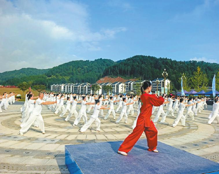 8月8日,全国健身气功助力乡村振兴志愿服务暨百城千村交流展示活动·曾家山杯四川广元站在曾家山举办。图为健身气功展演。陈平 摄