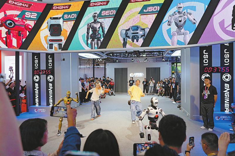 8月8日,工作人员和机器人在2025世界机器人大会上一同跳街舞。 新华社记者 谢晗 摄