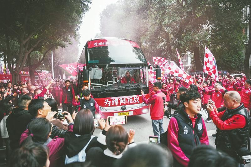 11月1日,绵阳九洲长虹队的球迷在三台县体育场外迎接球队。