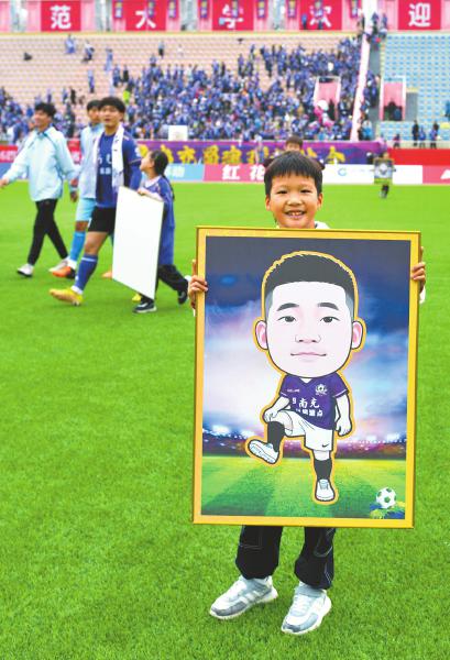 11月15日,“川超”比赛结束后,南充丝绸源点队的一名小球迷举着父亲的卡通肖像,为球队的获胜喝彩。