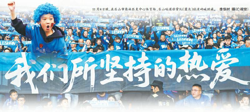 11月8日晚,在乐山市奥林匹克中心体育场,乐山味道非常队(蓝衣)球迷呐喊助威。 李华时 摄(C视觉)
